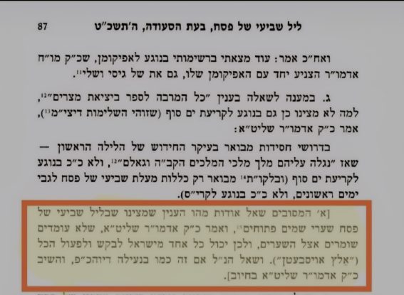 בעומדינו בערב חג שביעי של פסח בו שערי שמים פתוחים, זהו הזמן לנצל ולפעול ולבקש הכל כמו בנעילה של יום כיפור. כך מדברי הרבי. וכן מדברי הרבי הרייץ זהו ראש השנה למסירות נפש. שנצליח לפעול גאולה תיכף ומיד. לקטעים המלאים