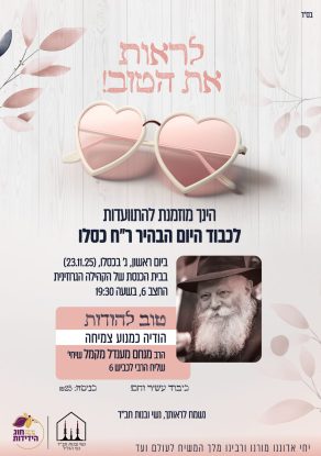 נשי חב"ד נוף הגליל מוזמנות להתוועדות ראש חודש כסלו, "לראות את הטוב", עם הרב מנחם מענדל מקמל, שליח הרבי לכביש 6. לכל הפרטים