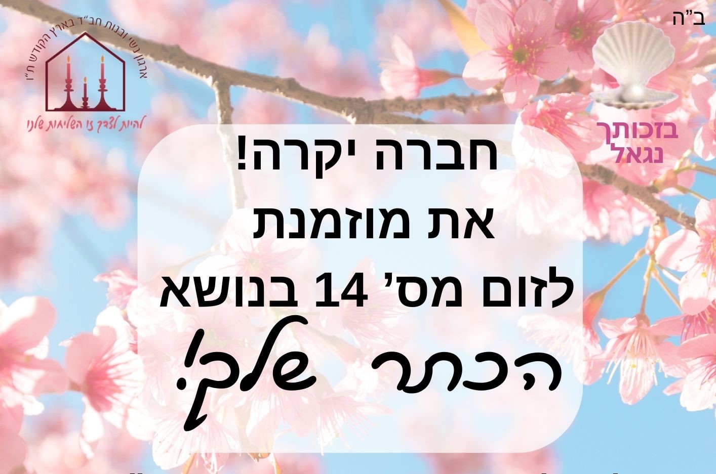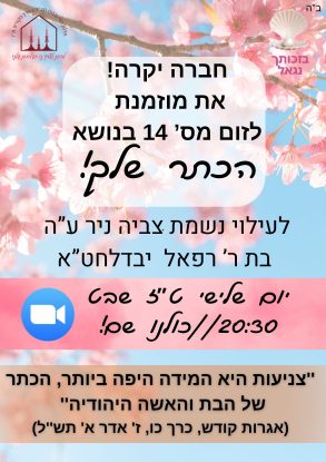 חברה יקרה! שימי לב יום שלישי ט"ז שבט זום מס' 14 - הכתר שלך. לעילוי נשמת חברתנו היקרה צביה ניר ע"ה בת ר' רפאל יבדלחט"א שפעלה רבות למען הפצת הצניעות. מחכות לך בשעה 20:30 בדיוק. לקישור לזום
