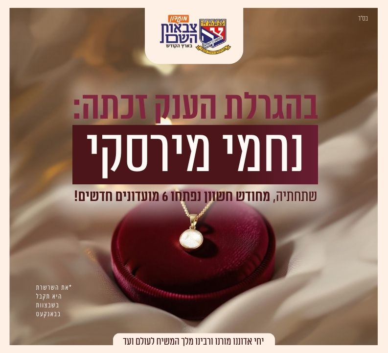 הזוכה בהגרלת הענק שתחת מועדוני צבאות השם על שרשרת עם בד מהרבנית, היא הרכזת נחמי מירסקי מירושלים. שתחתיה מחודש חשוון נפתחו 6 מועדוני צ"ה בירושלים והאיזור. עם מפקדות מסורות שפועלות במועדונים, אצל השלוחים מידי שבוע. בהצלחה בהמשך השליחות החשובה בצבא הרבי