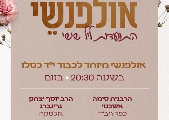 הערב, יש לך הזדמנות לכבוד י"ד כסליו להתחבר להתוועדות סוחפת באולפנשי של ליל שישי, בשעה 20:30 בזום. עם הרבנית סימה אשכנזי והרב גרינברג מאלסקה. למודעה המלאה ולקישור הזום