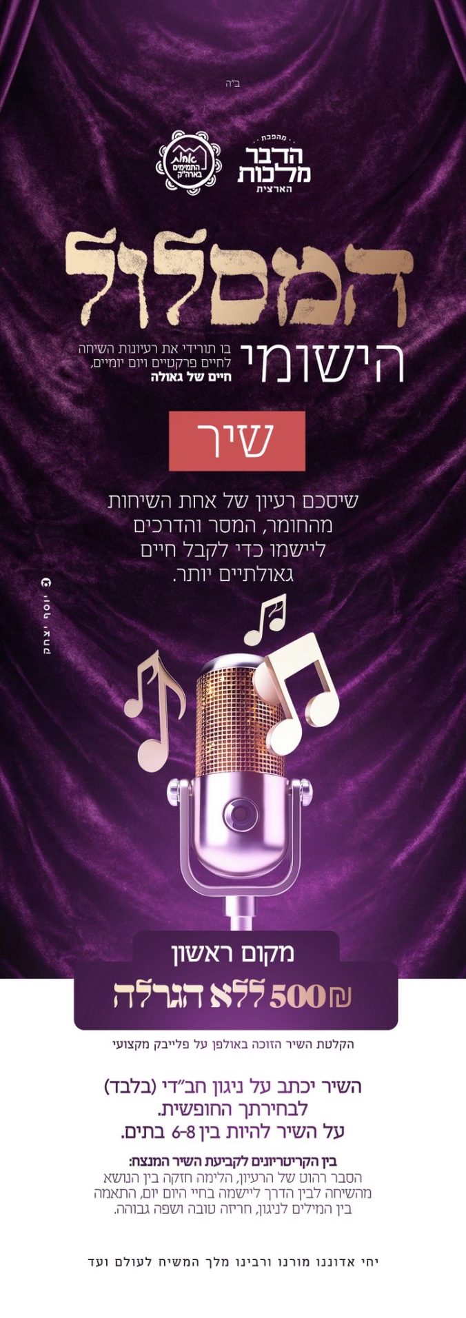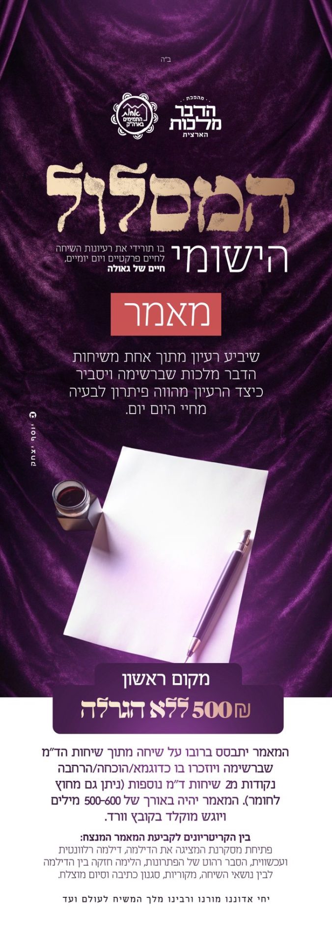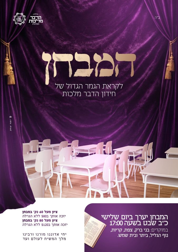 מהפכת הדבר מלכות השנתית של אחות התמימים מגיעה לשיא! בכ"ב שבט יערך המבחן במוקדים שיקבע מי הן 16 המתמודדות שיעלו לחידון הדבר מלכות התשפ"ו שיתקיים בכנס השנתי של אחות התמימים - בכ"א אדר באודיטוריום סמולארש תל אביב. בנוסף בכ"ב שבט תסגר האפשרות להגשת תוצרים במסלול הישומי. זו ההזדמנות שלך להצטרף למהפכה! • הכנסי לפרטים והרשמה למוקד הקרוב אליך.