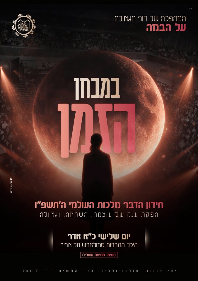 לראשונה: חידון הדבר מלכות העולמי תשפ״ו יתקיים בכנס ענק של אחות התמימים, והשנה בסימן: 'במבחן הזמן'. מהפכת הדבר מלכות השנתית תגיע לשיא, אל הבמה יעלו 16 מתמודדות אלופות שיפגינו בקיאות עצומה בשיחות. הכנס יתקיים ביום שלישי כ״א אדר בהיכל התרבות 'סמולארש' תל אביב. מקומות מיוחדים לנשים ובוגרות אחו"ת! מכירת הכרטיסים בקרוב. לכל הפרטים