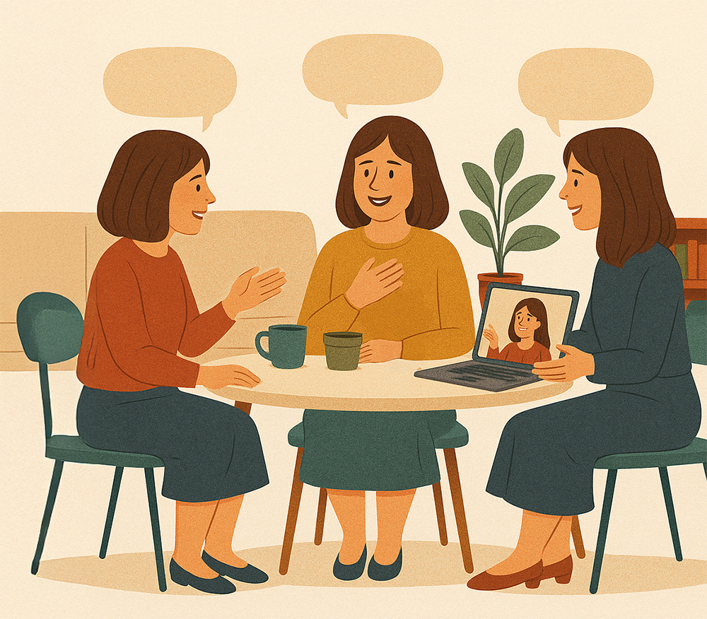 הן מהנהנות, כמעט יחד. מולה ליד השולחן ומן הזום.