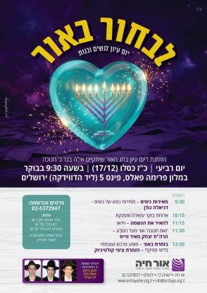 יום העיון המושקע והמסורתי שיתקיים בחג החנוכה בירושלים, המאורגן על ידי אור חיה, גם השנה ובהשקעה גדולה. בואי לגלות את הכח שלך ולהאיר באור יקרות את עצמך וסביבתך. למודעה המלאה